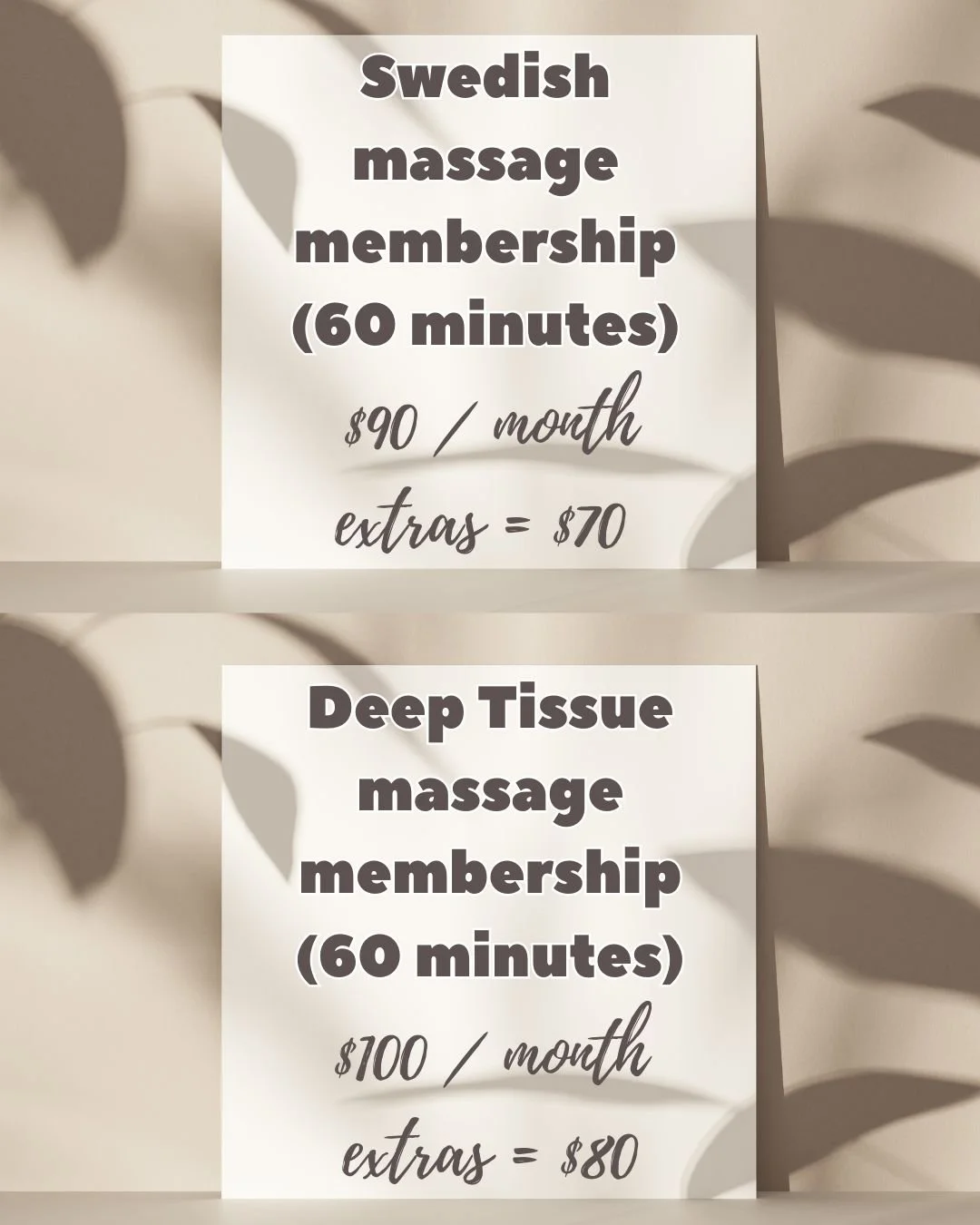 The massage membership includes one massage at $20 OFF the regular price each month. Additional massages will be $40 OFF the regular price. Any unused massages will rollover. You will be charged on the first of each month and can cancel or pause your membership at anytime. Massages and discounts are non-transferable to any other person.