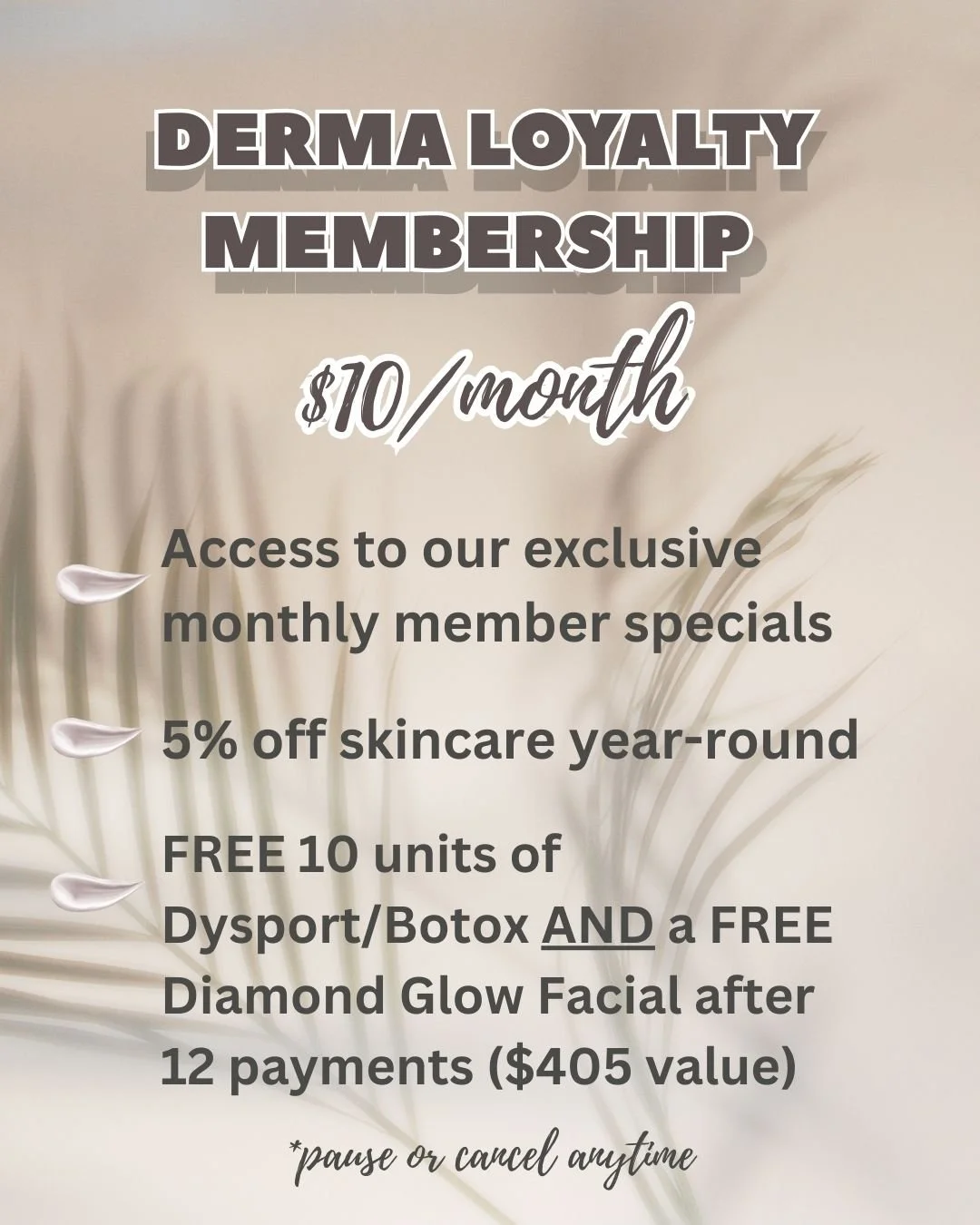 At Derma, we believe consistency is the key to radiant results and feeling your absolute best. We offer memberships to reward our most dedicated clients with exclusive pricing, monthly perks, and even freebies! Explore our Loyalty, Massage, and Diamond Glow Facial memberships below.